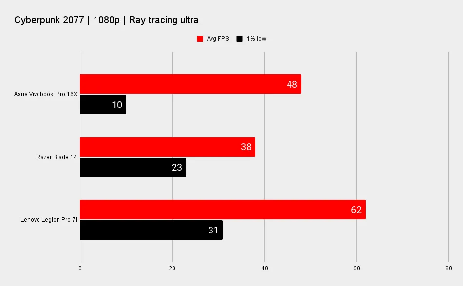 Однако для игрового ноутбука это довольно хороший показатель. Горячие микросхемы и OLED-экраны действительно тянут на себя всю нагрузку, но было бы неплохо увидеть большую выносливость от чего-то столь громоздкого и стильного.